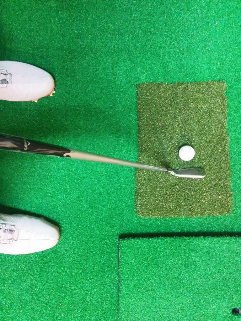 今日は午後から。課題のアイアンでのダウンブローのレッスン。やはりダフる感じがあるので、プロに相談。テイクバックからスイングの軌道が下にいってしまうのが原因とのこと。そこで、下記のように手前に人工芝を配置して、これが動かない、当たらないようにスイングするように練習をしました。